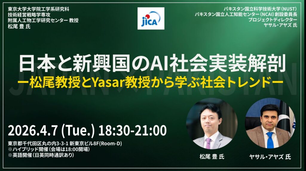 2026年4月8日(水)から開催のJapan IT Week 春での「パキスタン・パビリオン」出展に先立ち、デロイト トーマツ ベンチャーサポート株式会社主催により、「AI社会実装勉強会 – 松尾教授, Ya […]